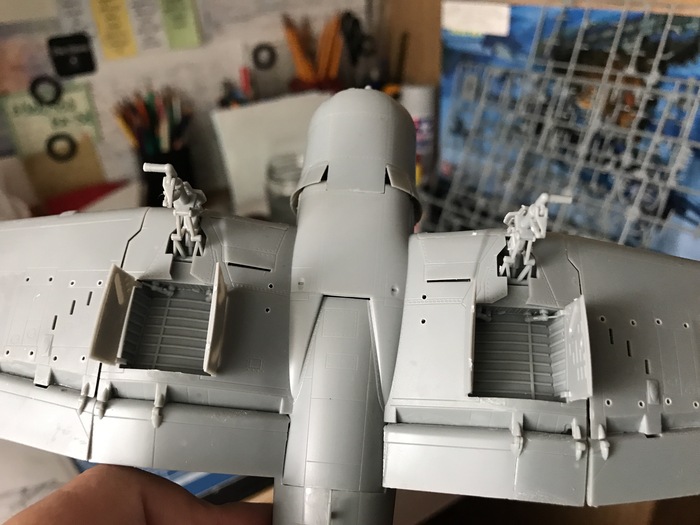 В сборке крыльев не было ничего сложного, но был один нюанс: с каждой стороны внутри крыла располагается по три пулемёта с лентами, которые производитель не забыл любезно напомнить покрасить, что я и сделал со всем прилежанием, даже забыв сфотографировать. Только после того, как я их полностью собрал, до меня дошло, что их не видно вообще никак, ни под каким углом. Но знайте, они там есть!