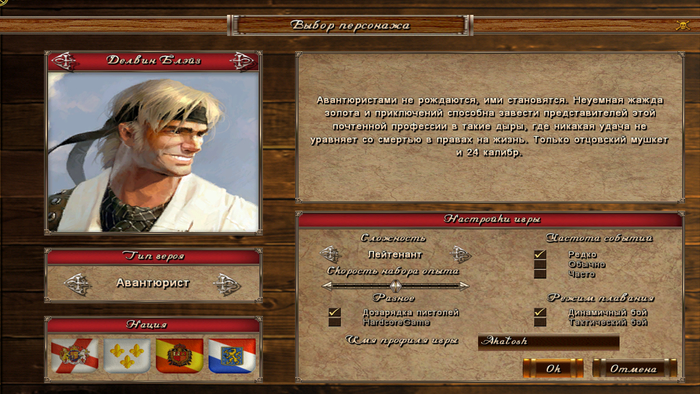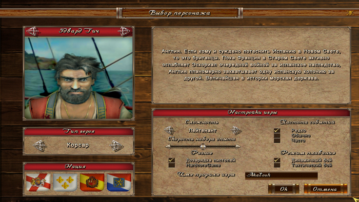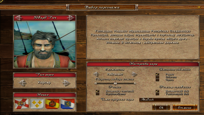 В общем всё стандартно. Как бы не так, потому что от выбора нации многое зависит. Любите отправиться сразу в бой? Что же, тогда выбирайте англичан, или испанцев, и поверьте, с порта выйти даже не сможете, как на вас кто-то нападёт. Хотите меньше проблем? Есть голландцы и французы. Ну вот детально рассказано, что из себя представляет та, или иная страна
