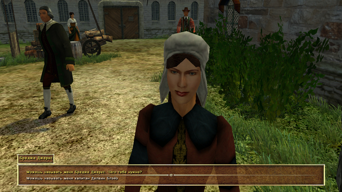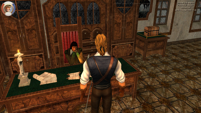 Губернатор как видите смотрит исключительно в стол, и ему скучно. Всё же он может дать вам задание, которое открывает возможность стать на службу короля Голландии, и после получать существенную зарплату, ну или пособие, не помню как называется. Когда же выйдете от губернатора, то непременно стоит поговорить с местным населением