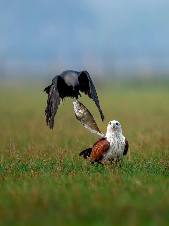 Ворона ворует рыбу у браминского коршуна⁠⁠