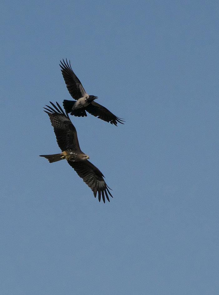 Самки, и коршунов и ворон, сидели на гнёздах. Самцы же охотились - каждый по своему. Коршун парил над рекой, ближайшим озером и разливами, высматривая добычу с высоты. Ворона-самец либо озирала окрестности с сухой верхушки, либо что-то выискивала, обследуя пешком береговую линию.