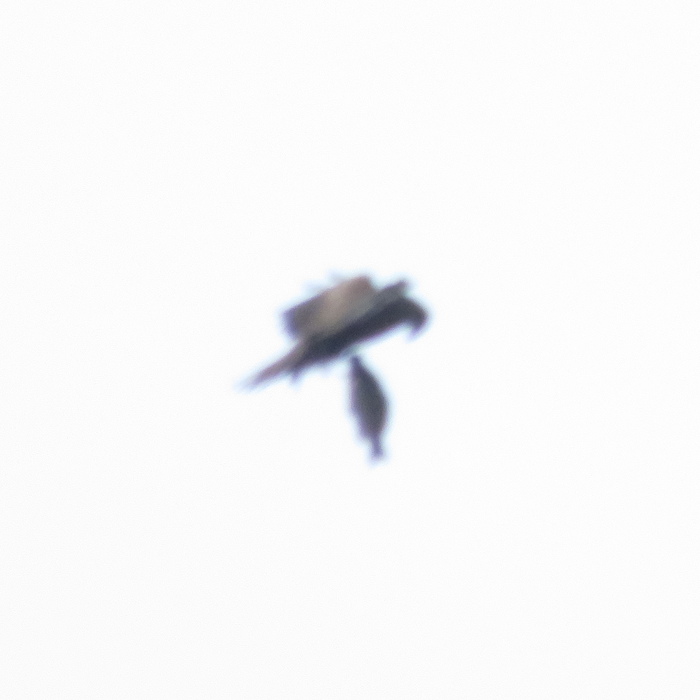 Оказывается, от гнезда к нему на перехват летела самка, явно с претензией на эту добычу. Но самец со своей "заначкой" уже кружил недостижимо высоко в небе. И спешно, прямо на лету поедал её. Самка, поняв, что "заначку" уже не отобрать, вернулась в гнездо. А самец, доев рыбу, тут же спустился с небес и продолжил охоту.