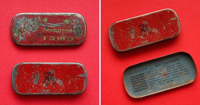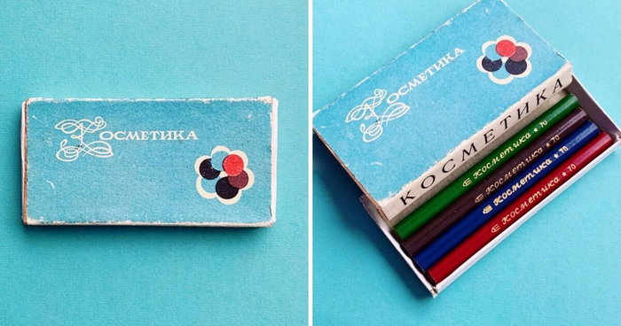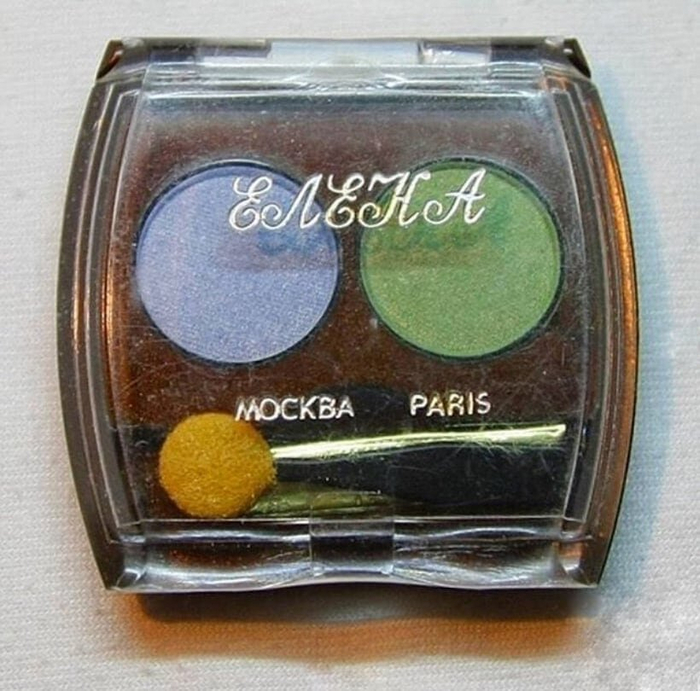 Московская фабрика «Рассвет» выпускала наборы теней «Елена». Стандартная коробочка включала два цвета, футляр-рыбка — три. Тени отличались безумно яркими цветами. Советские модницы предпочитали бирюзовый, синий, фиолетовый и изумрудный.
