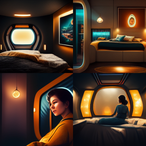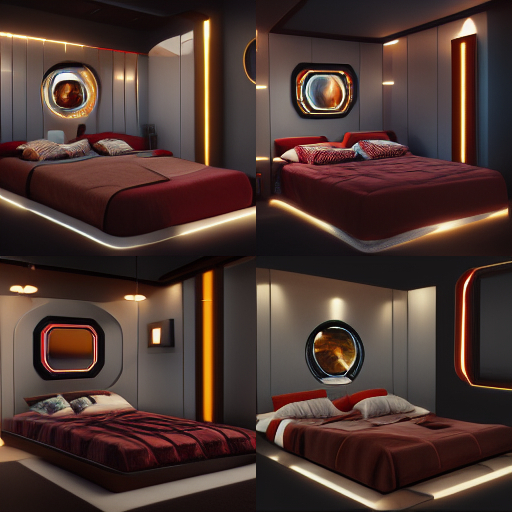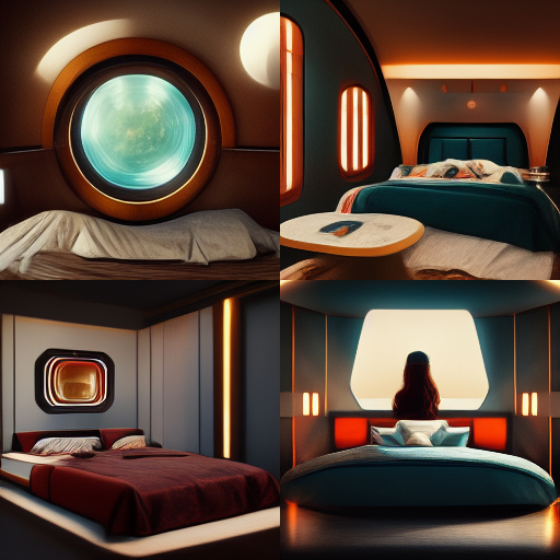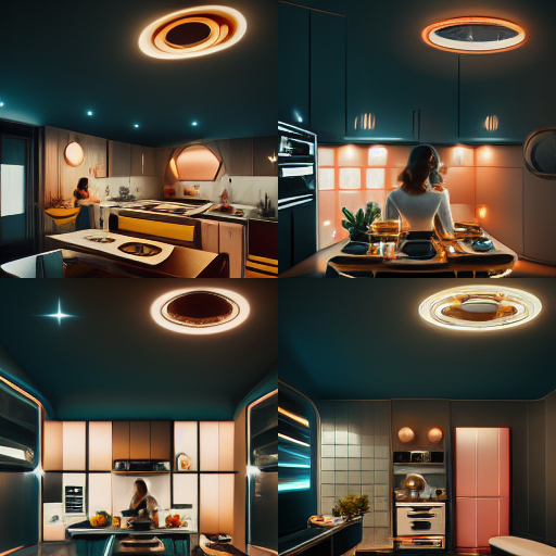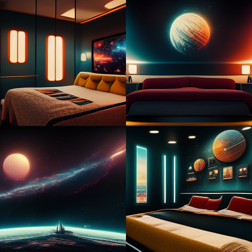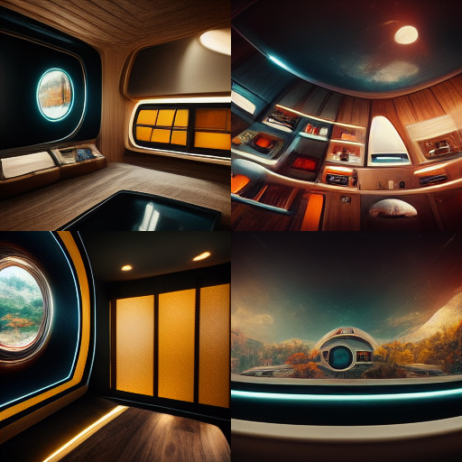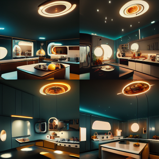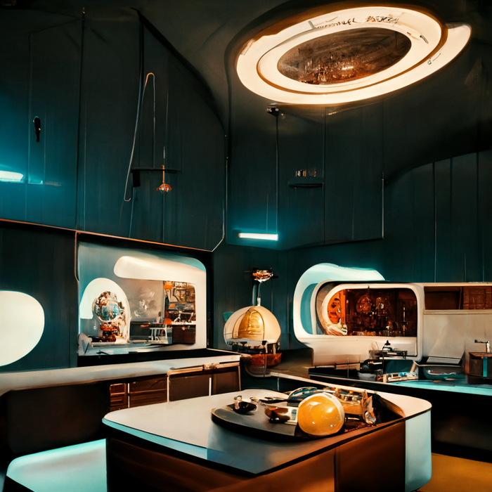 Интерьер в стиле “Космо”, в визуализации нейросети Midjourney может выглядеть так: