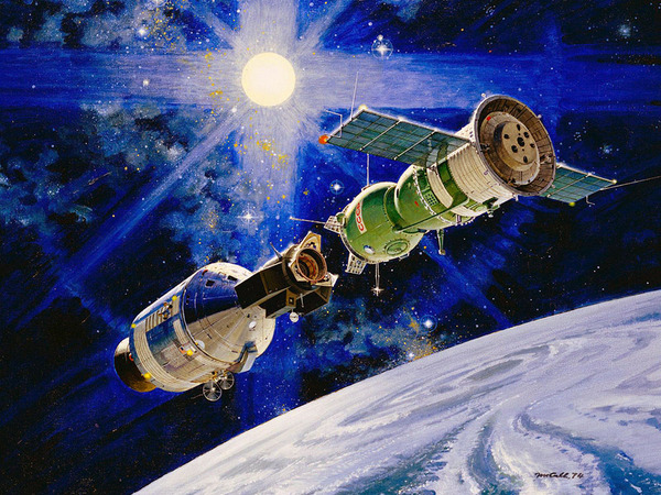 Союз — Аполлон. Хотя СССР и США так и не высадились вместе на Луну, они провели совместную миссию в космосе. 15 июля 1975 года была осуществлена стыковка и совместный полёт советского корабля «Союз-19» и американского «Аполлона». Экипажи обоих кораблей даже предварительно подучили язык друг друга: русские — английский, американцы — русский.