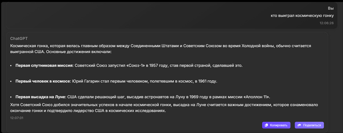 «С самого начала космическая программа США столкнулась с парадоксом: технологическое превосходство в сфере создания бомб обусловило отсутствие превосходства в космосе. США выигрывали гонку вооружений по той же причине, по которой проигрывали космическую гонку».