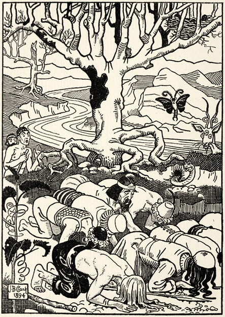 Немного отойдя в сторону, увидели реку полную вина и рыб, которые цветом и вкусом своим напоминали вино.Решив обследовать исток реки, отправились вверх по течению, но не нашли никакого источника, а вместо него увидели множество больших виноградных лоз, в форме женщин, к счастью они говорили на их языке и предложили поцеловаться, двое из команды согласились и превратились в такие же деревья.