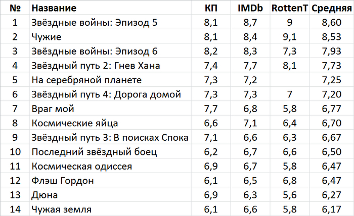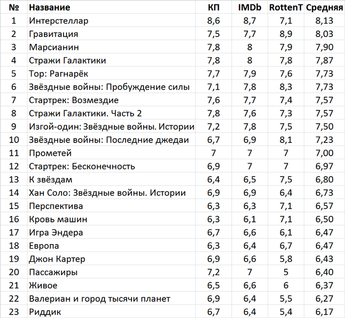 Таблица с рейтингами Кинопоиска, IMDb и Rottentomatoes.