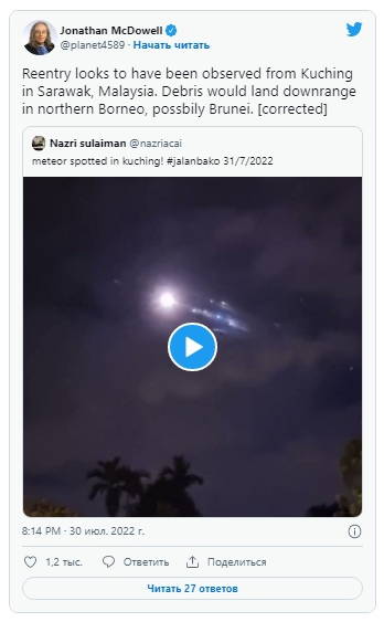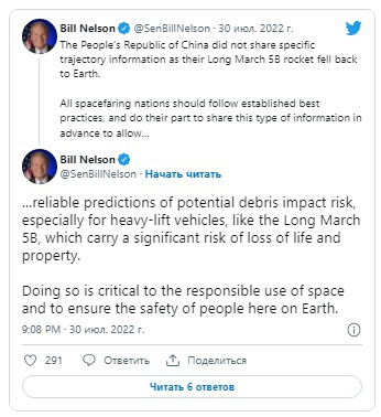 Администратор НАСА Билл Нельсон прокомментировал ситуацию в Твиттере вскоре после подтверждения входа в атмосферу.