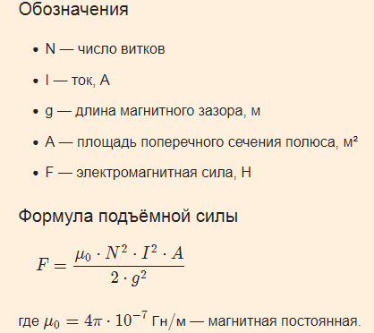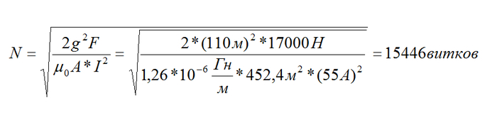 Подъёмная сила - F= 1700 кг=17000H Воздушный зазор - g=110м Площадь полюса - А=452,4м2 Сила тока - I=55А Найдём количество витков обмотки -