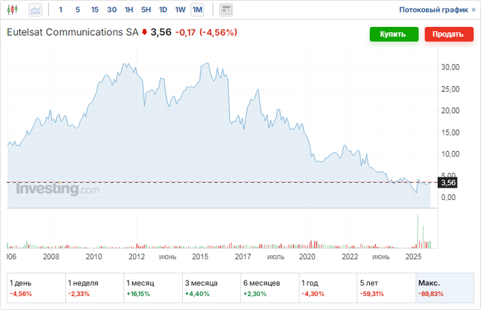 Ну а затем пришла эпоха Starlink, которые составил прямую конкуренцию как производителям геостационарных спутников, так и операторам. Сейчас у Starlink уже 7,6 млн. абонентов и их число быстро растёт. А вот у традиционных операторов уменьшается. Например, у Eutelsat убытки за прошлый год превзошли 500 млн. евро, а стоимость акций упала до исторического минимума: