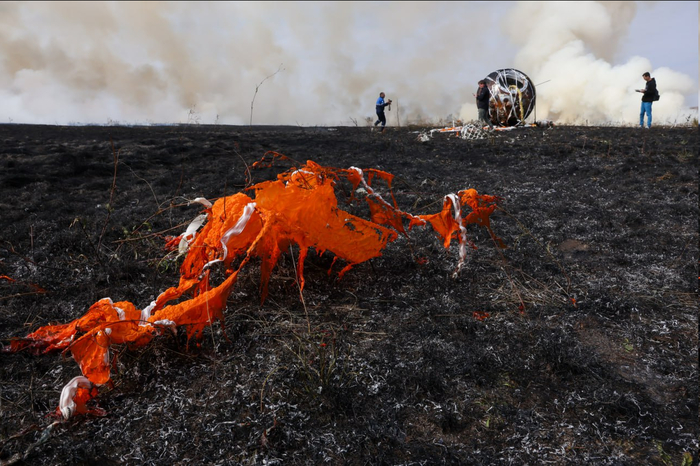 От чего загорается трава. Скорее всего от двигателей мягкой посадки. Да, у "Биона" в отличие от СА "Союза" на днище нет шести твердотопливных двигателей. Зато они есть в месте крепления парашютной системы, как бы над спускаемым аппаратом. Они срабатывают, чтобы смягчить удар от падения о Землю. Ну и потом от них же и загорается трава.