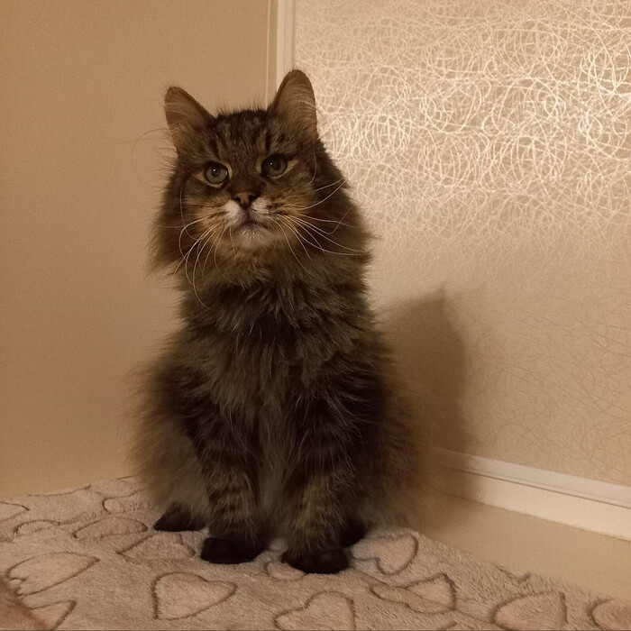 Очень харизматичный, пушистый, толстые лапы.