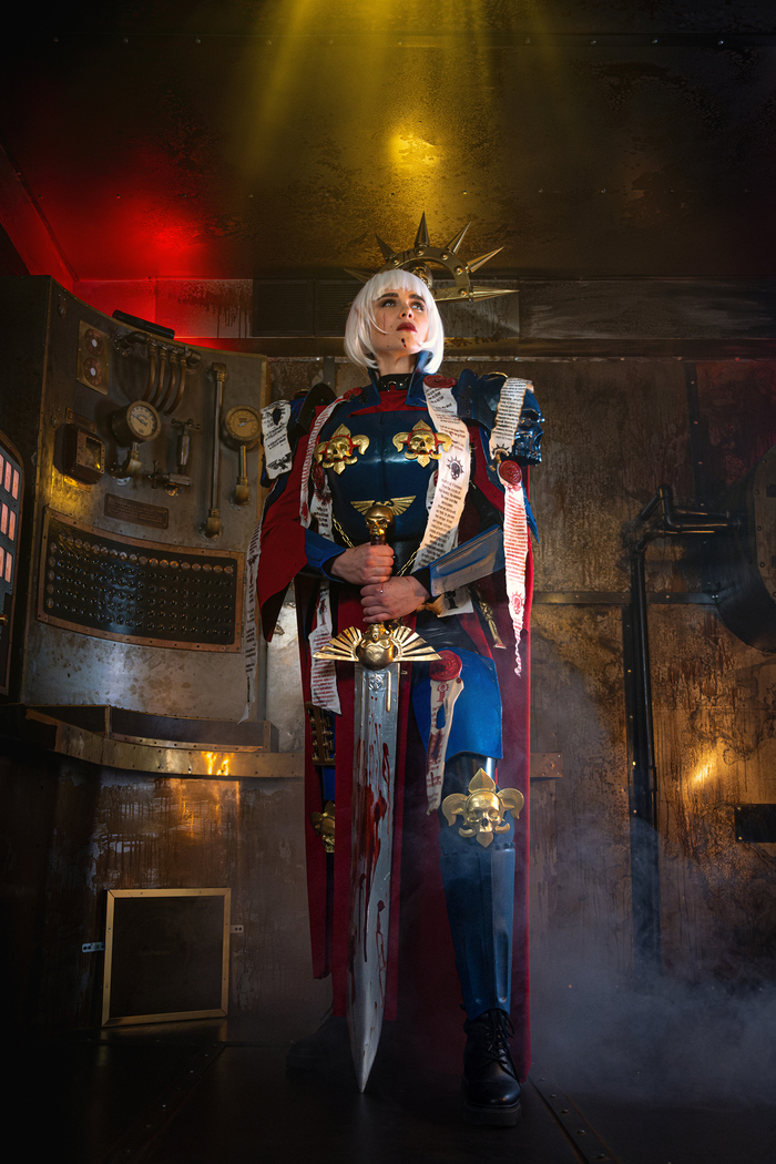 Пока ваха-любители красят миниатюры, мой муж сделал сороритку из меня. Распечатал на 3d-принтере доспехи, покрасил, закрепил на мне, отснял. Вот наш косплей Adepta Sororitas.