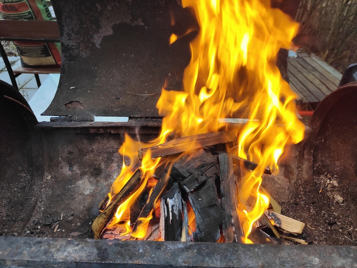 Что касается итогов самого похода. Место куда мы отправились оказалось нехоженым за всю зиму. Там был глубокий снег выше колена, поэтому далеко забредать не стали. Нашли тихое закрытое место за распиленным деревом, выкопали себе полянку для кресел и костра, которая оказалось больше похожей на комнату, и сидели там. Костёр из выкопанных дров разжигали с трудом и практически на грани того, что он погаснет и у нас уже не хватит растопки чтоб его раскачать до достаточного жара, который бы начал сушить последующие дрова. Хотя казалось бы мы люди вполне умудрённые походами. Однако справились и после этого победно страдали от дыма.