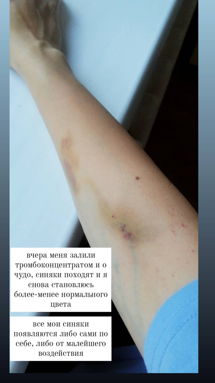 А ещё на низких тромбоцитах я была в крапинку. Из-за крайне низких тромбоцитов на теле появлялись петехии-маленькие кровоизлияния в кожу. Стоило почесаться и я вся была в синяках будто бы меня избивали.