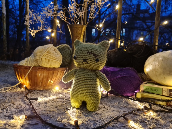 Котик-зомби показался мне самым простым, так что я начала вязание с него. На его вязание я потратила 2 дня и больше всего с ним экспериментировала тело я перевязывала 2 раза и голову тоже.