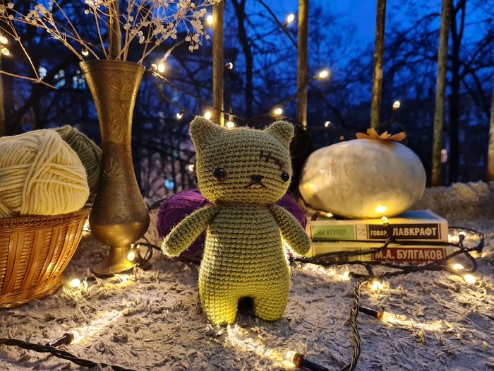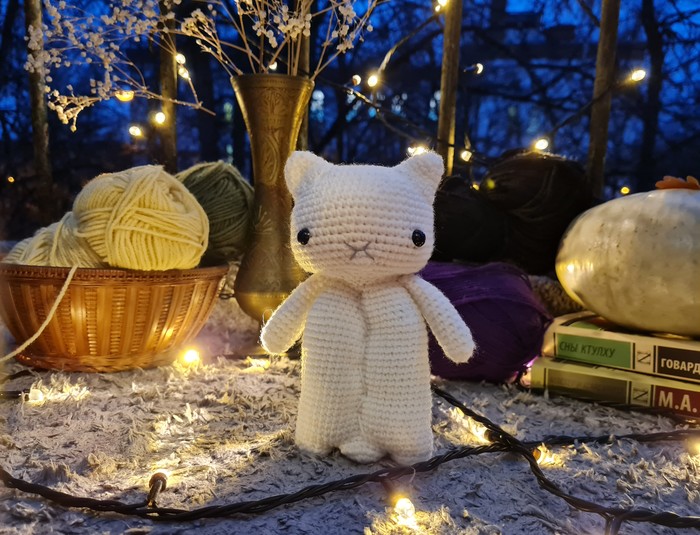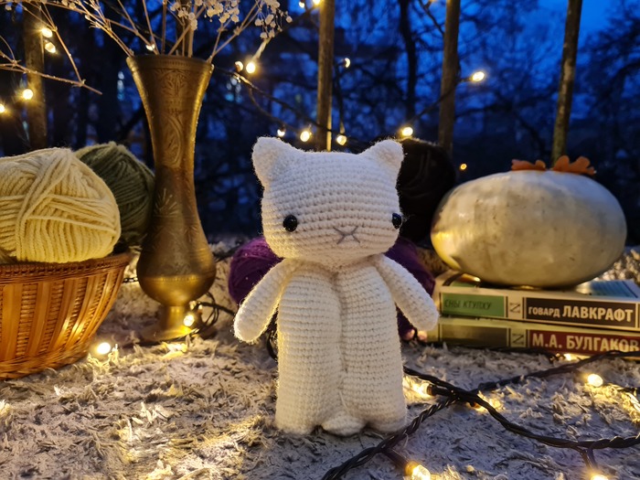 Больше всего я провозилась с Котик-приведением. С головой котика все просто, но его тело я распускала и перевязывала с нуля аж 3 раза. Конечный результат меня приятно удивил. Этого котика очень приятно держать в руках из-за того, что его тело разделено на 2 части, его прям не хочется выпускать из рук.