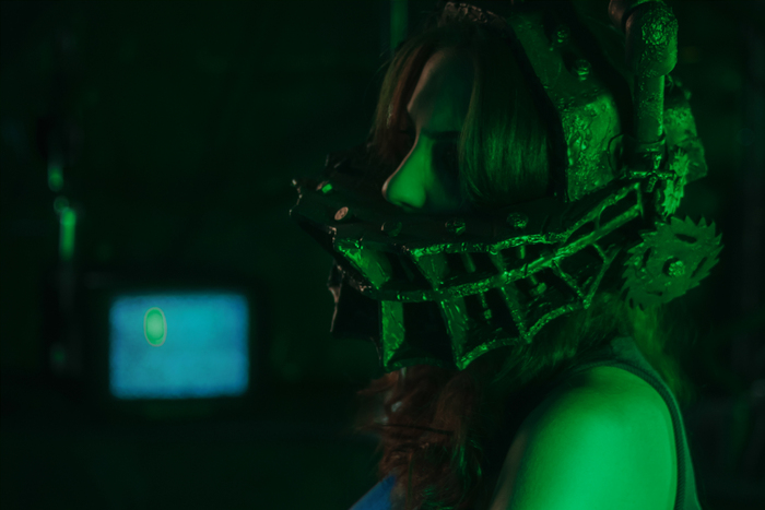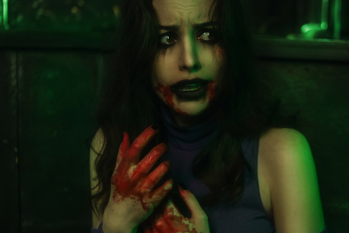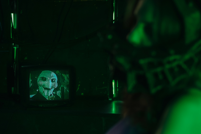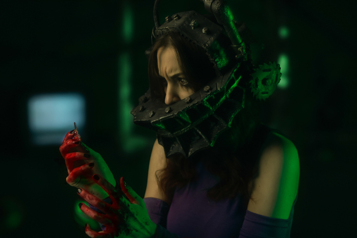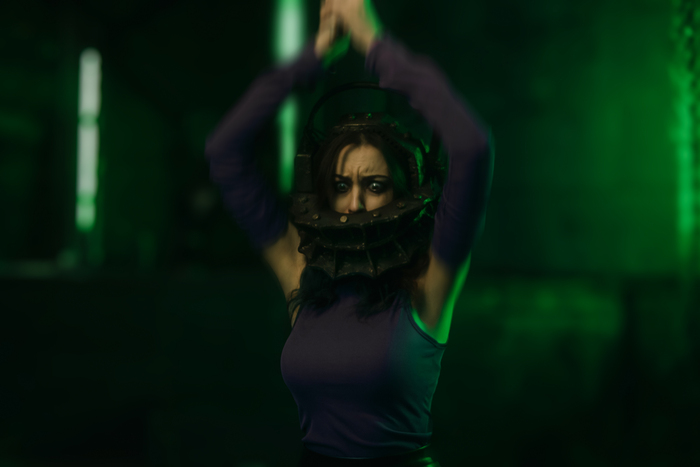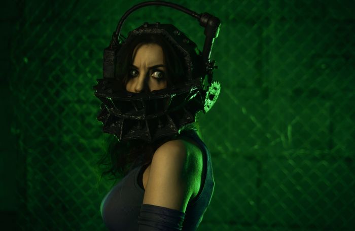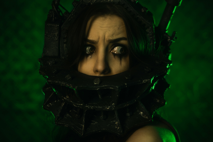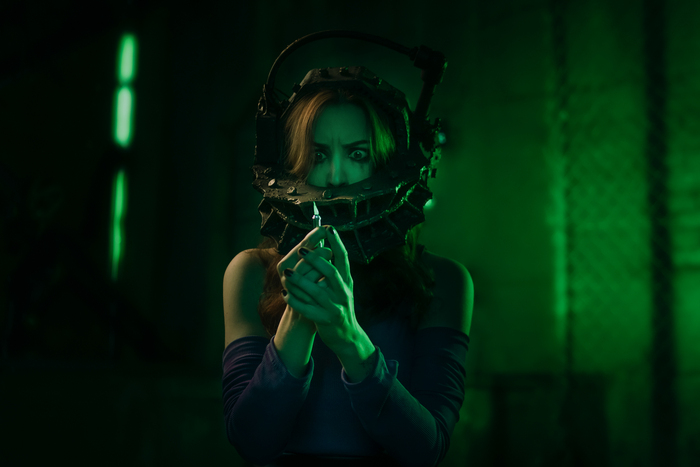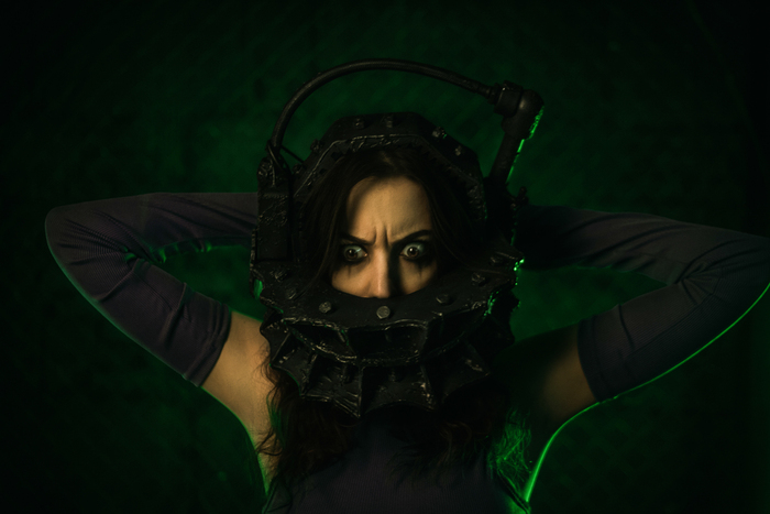 Маска ждала своего часа с зимы, но до студии ноги дошли только в прошлом месяце. По студии искала чем хуже, тем лучше (но с наличием работающего телевизора и стула с подлокотниками). Идеален был бы засратый подвал, но пришлось бы тащить кучу оборудования, в сцене испытания Аманды довольно много света (хотя с первого раза и не скажешь: по бокам зеленые ргб-палки, позади октобокс, прямо в лоб светит прожектор, плюс мигают вспышки).