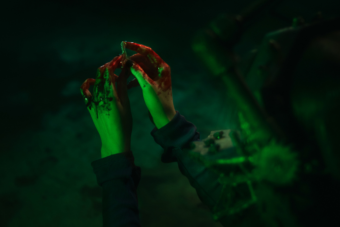 Цветокор тоже брался из фильма (желтый основной свет, плюс зеленый заполняющий свет от палок в тенях). Из-за него почти убился весь цвет крови и кофты, которые исказились до грязно-малинового и розового.