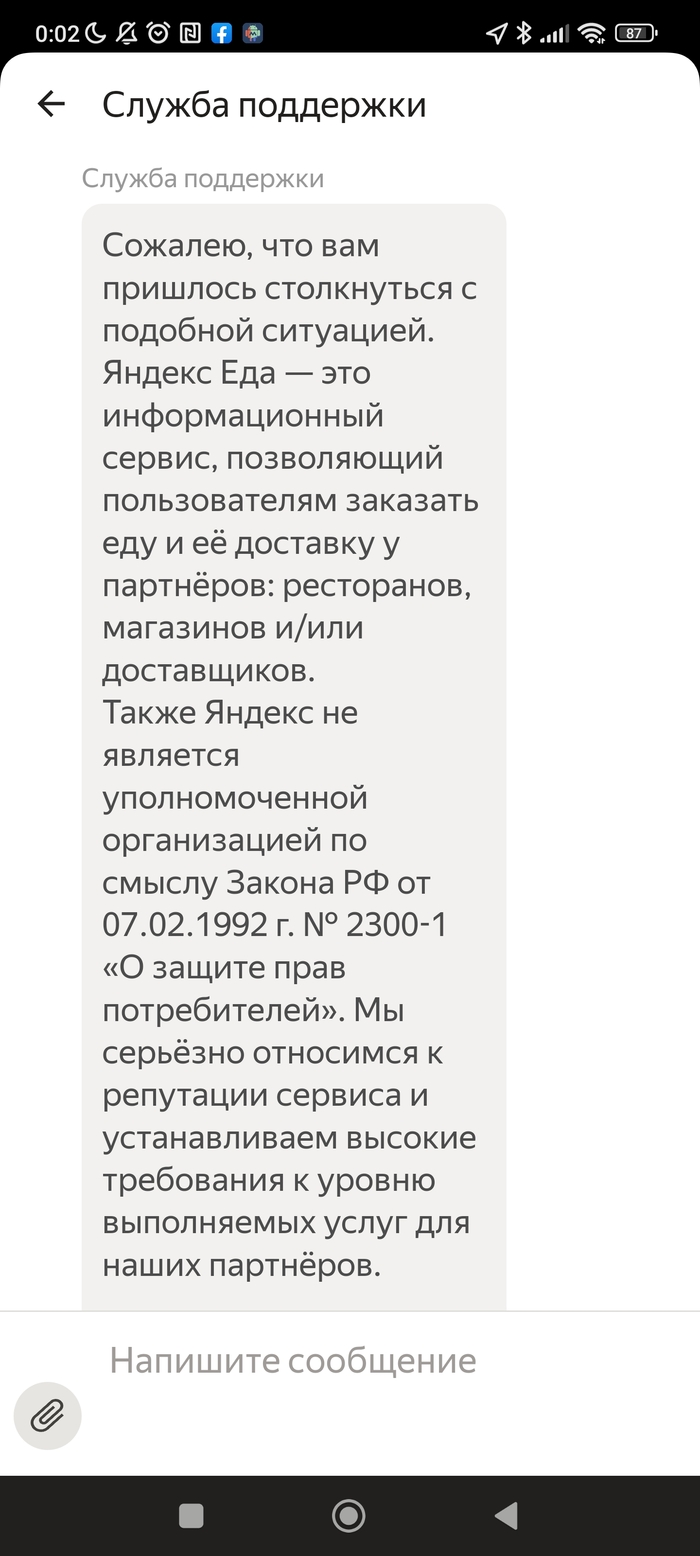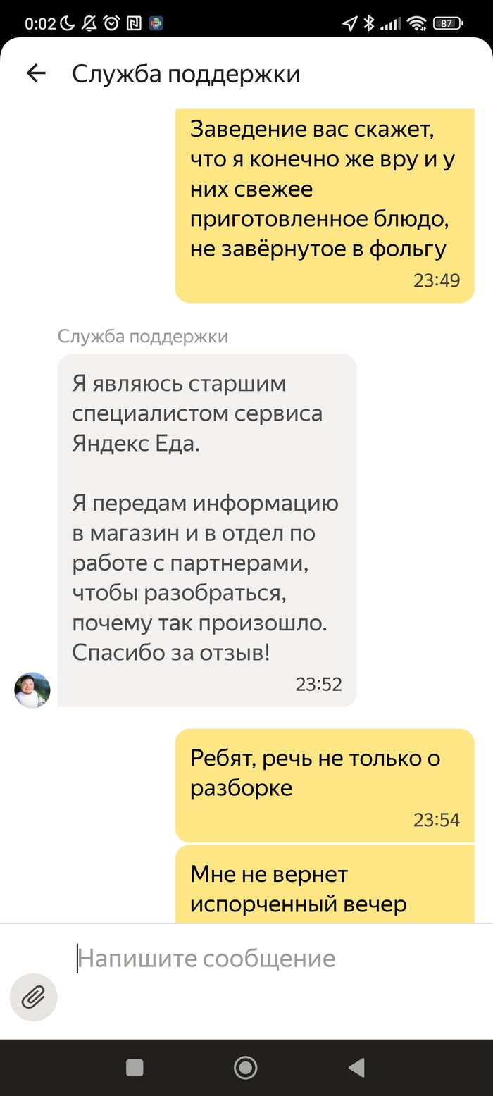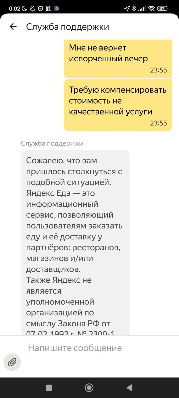коротко. Заказал еду, еду приехала холодная, явно готовили пару часов назад. Предложил Яндексу решить вопрос и компенсировать, на сто меня отправили в заведение. При этом такси, лавка и маркет без проблем компенсируют свои косяки. У меня вопрос к @yandex,а не ухуели вы?