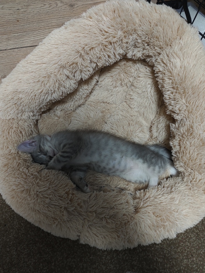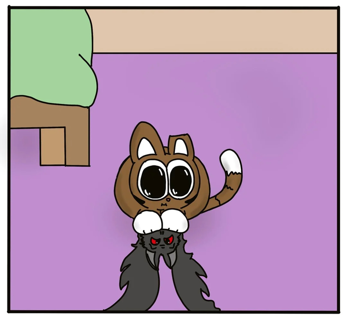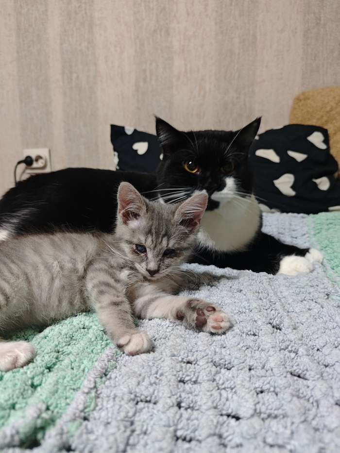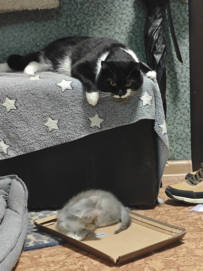 Умная девчонка. Если есть вопросы пишите. Муви принял её) вылизывает, терпит когда она играется с его хвостом, наблюдает за ней. Котобатя)