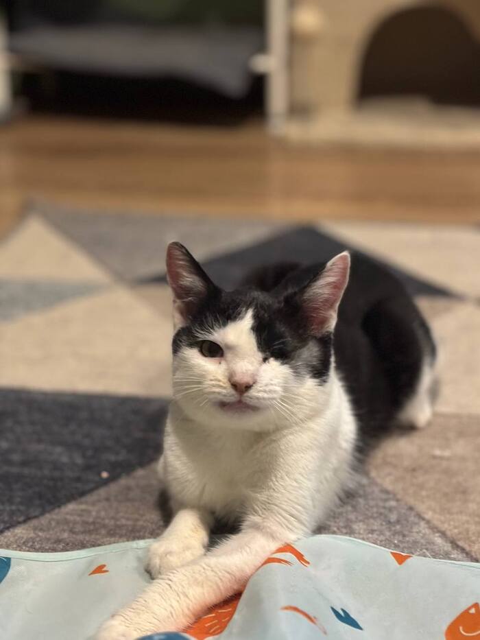 Сейчас он живёт на передержке, полностью здоров, кастрирован, отлично ест, ходит в лоток, никаких «особых условий» не требует.
