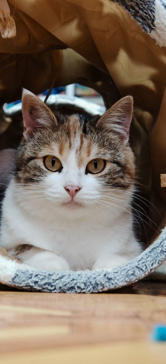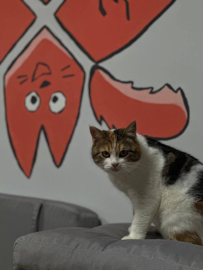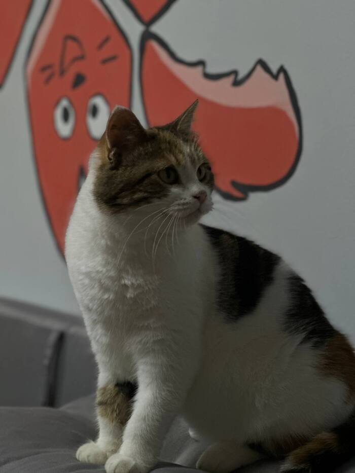 Трёхцветная красавица с очень мягким характером. Лети здорова, обработана и бесконечно любит людей. Она обожает сидеть на коленках, подставлять голову под руку и громко мурлыкать — так, будто благодарит за каждое прикосновение.