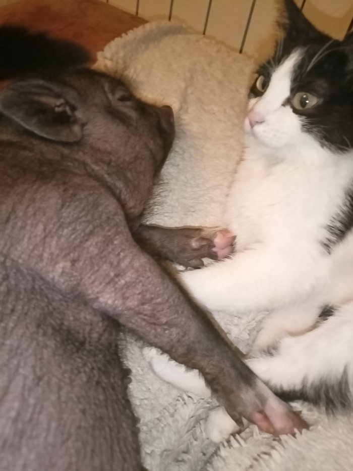 Короче у меня дома Маугли и Тарзан в свинячьем исполнении. В общем Булка считает себя кошкой. Сначала она начала перестала есть свое, и начала есть вместе с кошками. Причем дралась и гневно хрюкала к примеру за кусочек курицы (причем ей мясо не нравится, она жует его, плюет, смотрит что все едят и снова ест). Кошки знатно прифигели, и стали запрыгивать с едой и прятаться в недосягаемые для свиноты места. Дальше Булка понаблюдала за кошками и освоила их лотки. Теперь у нас иногда очередь в лоток, причем в очереди всегда только кошки, Булку совершенно не смущает если кто-то сидит в лотке, она туда залезает - пихает кошака, типо "подвинься" и делает то зачем пришла. потом кстати закапывает на кошачий манер. Но вчера уже реально край был. Я значит лежу на диване, читаю книжку, рядом одна кошка, запрыгивает другая - милота. Тут раздается возмущенное хрюканье и пыхтение. Оглядываюсь, а на диван ругаясь на все лады лезет Булка. Причем жопа же толстая, и если ноги она еще кое-как закидывает, то остальную часть она закинуть не может никак, но ооочень хочет. Свинота моется каждый день, так что в принципе чистая. ну уж явно не грязнее кошек. Мне любопытно чем дело кончится. В результате Булка все же осилила высоту и залезла на диван. Дальше самое интересное, если кошки просто ложаться сверху и спят либо залазят целиком под одеяло, то хлебобулочный свин закопался под плед целиком, потом высунул голову как делают люди и приготовился спать! Такой наглости я уже не выдержала и выдворила ее на пол. Как же меня материли на свинячьем, высказали кажется все что про меня думают, про то какая я эгоистка, и как бедной свинке плохо и холодно на полу, и что мне жалко что ли? высказав все что она обо мне думает, Булка удалилась в угол под стол, прихватила с собой тряпку и закопалась под нее, всем видом показывая что мне должно быть стыдно!