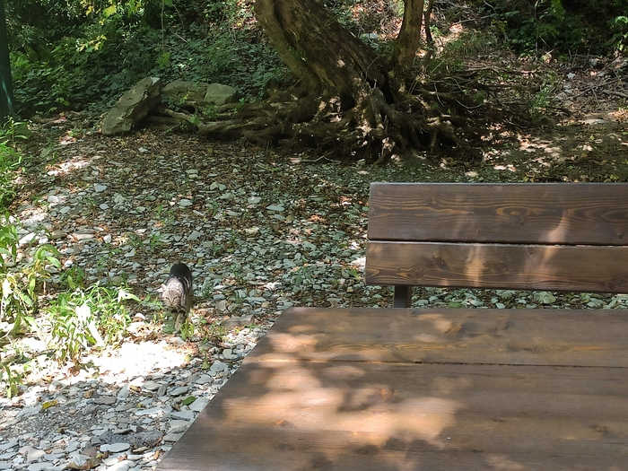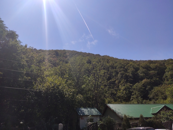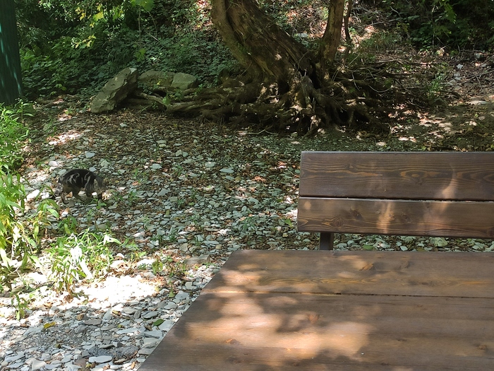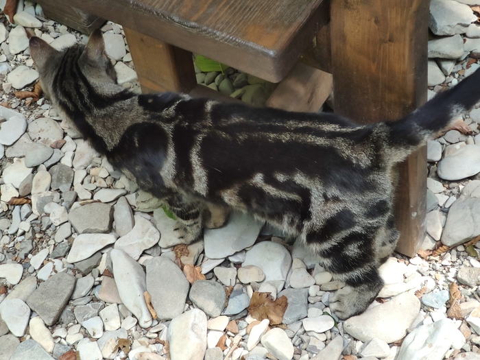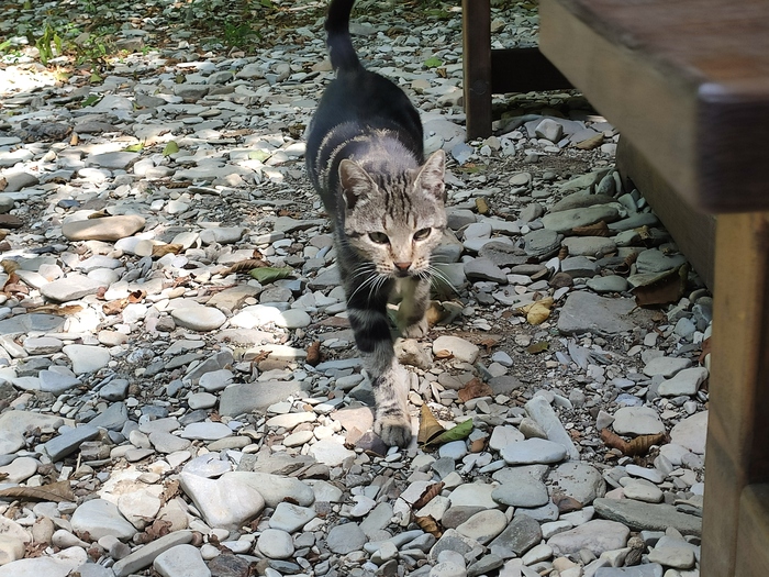 Заехали в придорожное кафе у подножья горы, где то между Новороссийском и Джубгой. У подножья горы течёт кристальной чистоты ручей и там же столики стоят. Пока изучали меню, вышел к нам из леса котяра. Кот был накормлен, поглажен и сфотографирован.