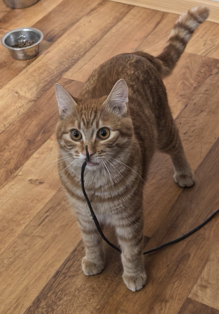 Недавно он украл шнурок и с истинно инженерной изобретательностью соорудил себе развлекалово: наматывает его вокруг ножки стула либо столбика когтеточки – и свободный утекающий конец пытается поймать.