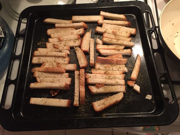 5. Затем я смочил все гренки маслом в котором держал чеснок и выложил на противень, где уже посыпал их хмели-сунели, а затем чесночком и посолил. После всех вышеперечисленных манипуляций, убираем противень в духовку, предварительно разогретой до 160 градусов, на 5 - 7 минут. Гренки очень быстро готовятся, будте внимательны!