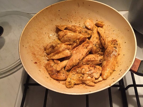 6. Добавить еще масла на сковороду и пожарить курицу. Я пожарил с легкой, золотистой корочкой.