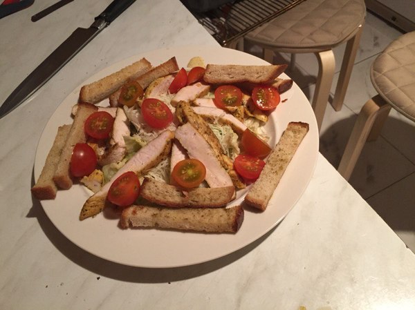 Добрый день пикабушники! Решил вечерком приготовить салатик. Есть у меня один рецепт салата, который по сути является очередным вариантом Цезаря, не сложный в приготовлении, не дурно на вкус. А я являюсь большим фанатом Цезаря. Для салата нам потребуется следующее: