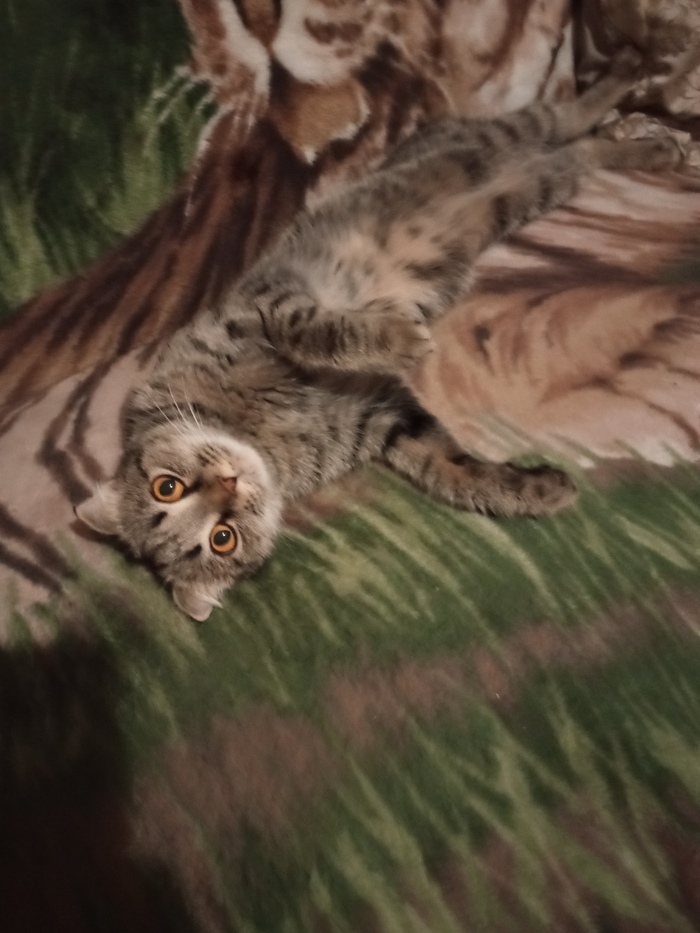 Ласковый, тарахтит как трактор. Подходит, ластится, ложится на ноги (последнее фото), но скажешь - я занята, иди полежи в тенечке, отходит и лежит) Самостоятельный, при нас дважды поймал мышей.