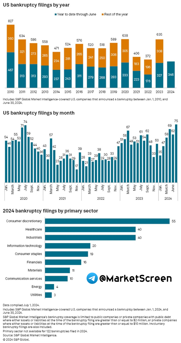 Июнь ознаменовался историческим всплеском числа заявлений о корпоративных банкротствах в США, причём их число стало самым высоким за один месяц, по крайней мере, с начала 2020 года, и превысило полугодовые показатели, наблюдавшиеся более чем за десять лет.