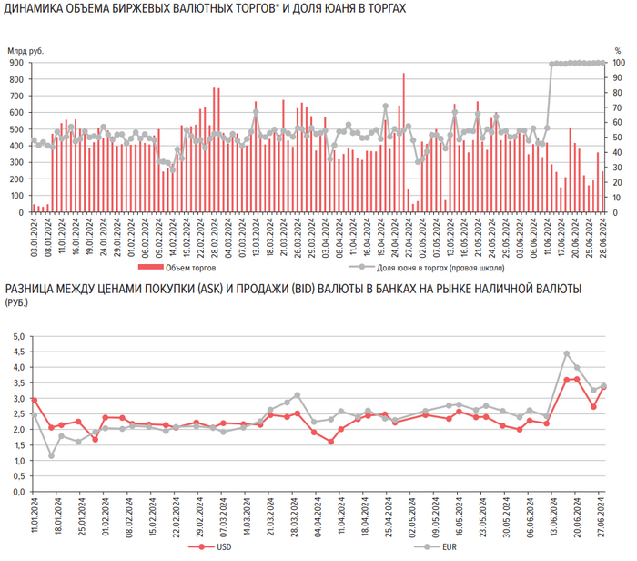 Одной из первоначальных реакций рынка на введение ограничений стало резкое расширение спредов на покупку/продажу наличной иностранной валюты в банках. Пиковые значения пришлись на 17–20 июня, однако к концу месяца началось сужение спредов как по долларам США, так и по евро. Несмотря на то что текущие уровни спредов выше, чем с января по май 2024 г., они гораздо меньше показателей 2022 года.