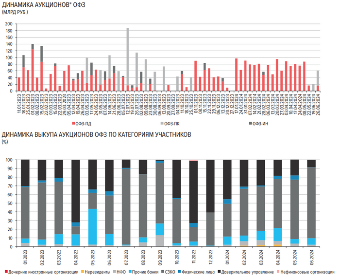 Объем размещений ОФЗ на аукционе снизился и составил всего 8,2% от плана на 2 квартала. Таким образом, Минфин разместил только 50,6% от запланированного объёма. Основной объем пришёлся на бумаги с переменным купоном (срок до погашения - 13 лет). Выпущенный впервые с октября 2023. Спрос превысил объем фактического размещения в 7,7 раз. Вопрос, когда там была оферта, что так все накинулись на переменный купон.