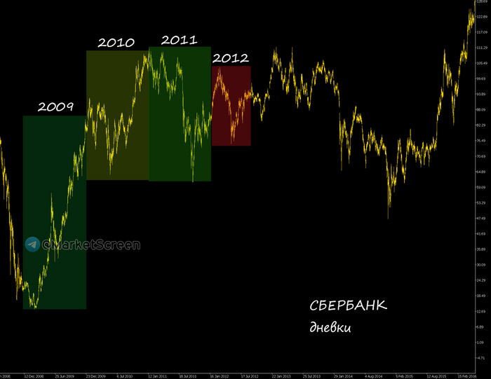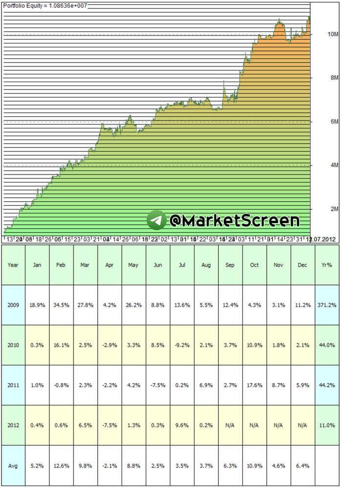 А вот вам и подвох. Хотя я и был достаточно честен. Смотрите на график. Года отмечены разноцветными прямоугольниками. Вы уже поняли, отчего такие разные результаты? Диапазон движения цены за год. У нас же стратегия заключается в том, чтобы войти в позицию на пробое какого-то начального диапазона и сидеть до какого-то конца. Т.е. при постоянных направленных движениях мы получаем прибыль. И вот 2009 год. Год дикого безудержного роста. И у нас 371% прибыли. В 2010 году рост был не такой безудержный и 44% роста. 2011 роста не было. На было неплохое падение в течение года. А мы же честны сами с собой. Мы работаем в обе стороны, поэтому и на падении мы заработали 44% роста. Смотрите, оба года по 44%. И оба года примерно одинаковый диапазон движения цены. А вот 20212 - никакашка. Стоит на месте. И вот уже всего 11%.