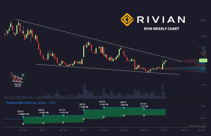 Вот у Ривиан все хорошо с фундаментальными показателями. «Продажи на акцию» люто туземунят квартал за кварталом, а акции тоже растут. Только отрицательно.