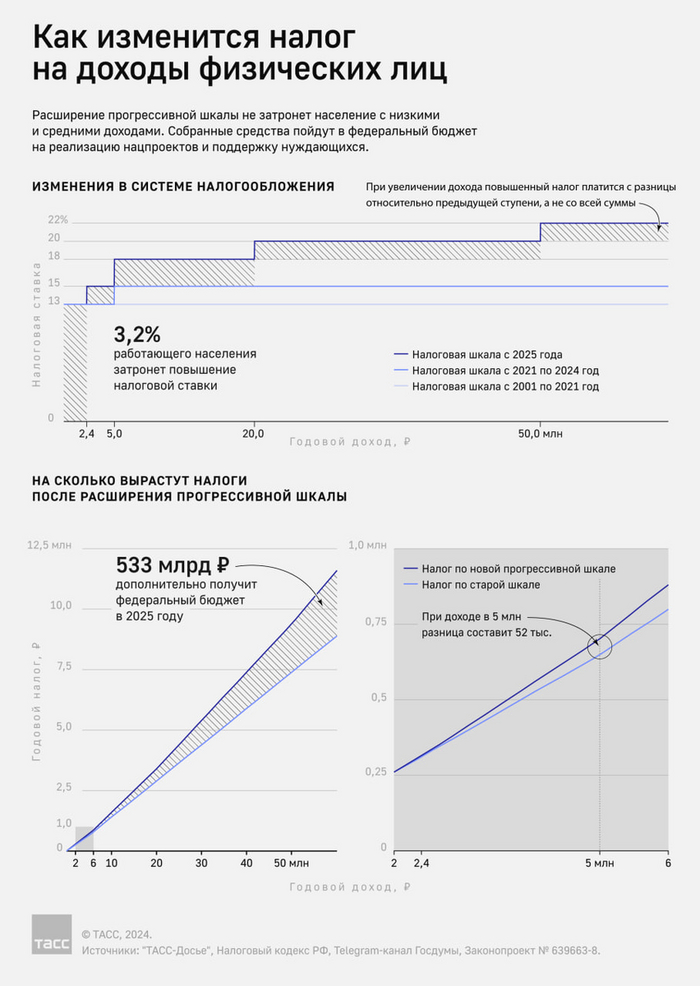 Собственно, о чём мы ещё раз хотели бы напомнить? Все эти изменения большинства граждан не коснутся. А кого коснутся (в основной массе) - будет это в 2026 или в конце 2025. Почему? Потому что любые изменения налогового законодательства применяются уже к будущим налоговым периодам. 2024 год пройдёт по старым ставкам. А дальше новые ставки начнут применяться только тогда, когда общая сумма дохода перевалит за лимит. Т.е., к примеру, за 10 месяцев 2024 вы получили 2,4 млн.₽ (по 240к в месяц), доход за 11 и 12 месяц у вас пойдёт уже по ставке 15%.