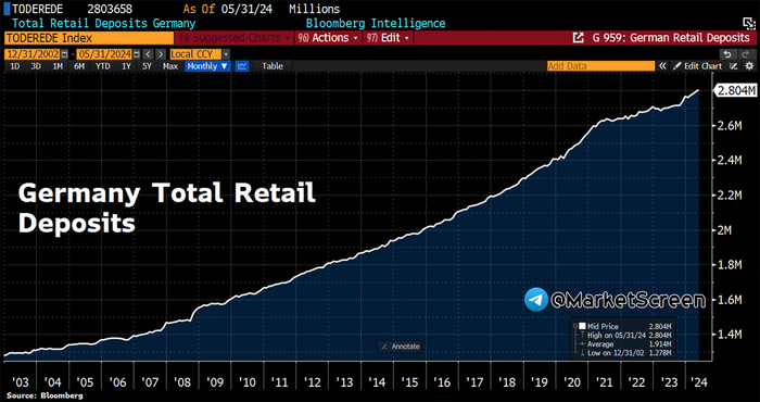 Депозиты физических лиц в Германии достигли рекордного уровня. В мае общий баланс составил 2,8 трлн евро. Треть из этих средств хранится на текущих счетах, которые не приносят процентного дохода. Т.е. многие немцы упускают потенциальную отдачу от инвестиций.