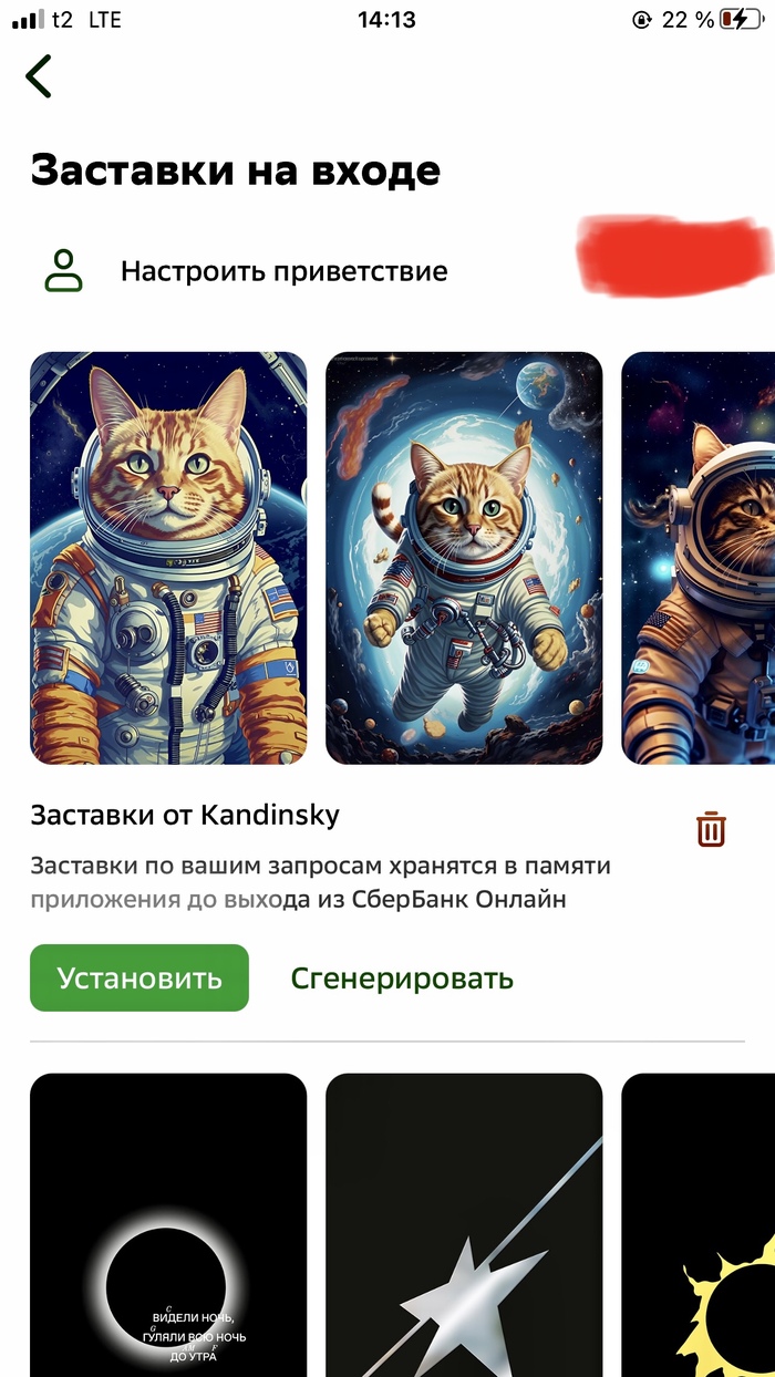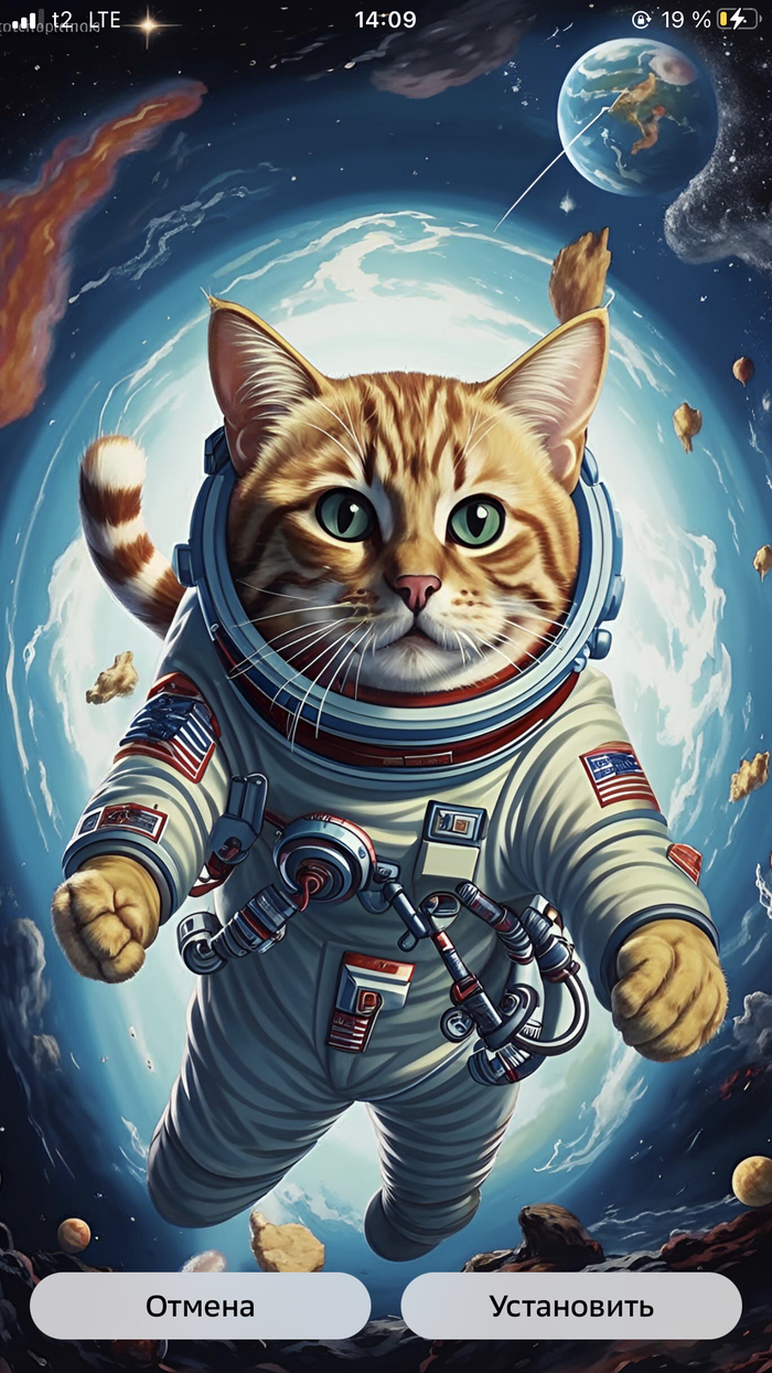 Решила сегодня сменить стандартную заставку от Сбера, на ту что предлагает их нейросеть Kandinsky. Захотелось котика в скафандре, после недолгих раздумий ИИ выдал мне картинку