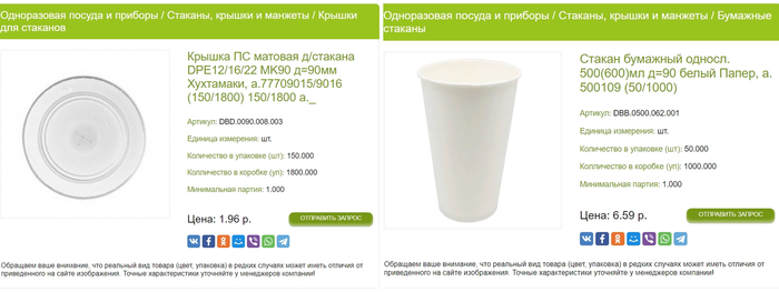 Я воспользовался компанией «Реал», т.к. у них более удобный каталог. Начнём с McDonald’s, найдя на сайте бумажный стаканчик (https://realpak.ru/catalog/9624) и крышку для него (https://realpak.ru/catalog/7561), чтобы сопоставить цену.