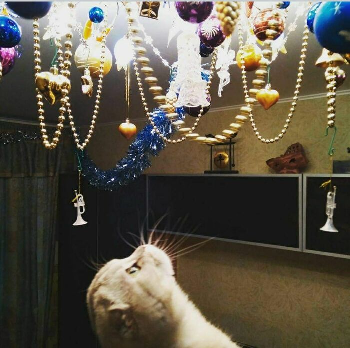 Мы её останавливаем вопросом: Ниф, ты чего это? А она смотрит безумным взглядом и лапой под себе мишуру гребёт, и в глазах огромных блестит: ПАМАГИТЕ!