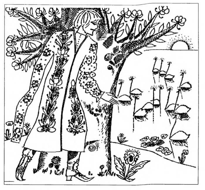Потом немножко полежал, как оглянулсе назад, то смотрит - назаду уже стоит большой дворець, а кругом сад, и он пошол к этому дворцю. Приходит во дворець: стоит на столы пища, всево довольне, на што только зглянеш, садись и еш.