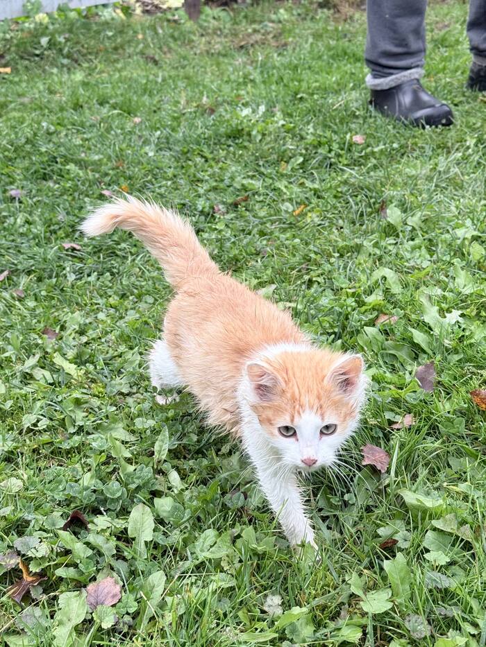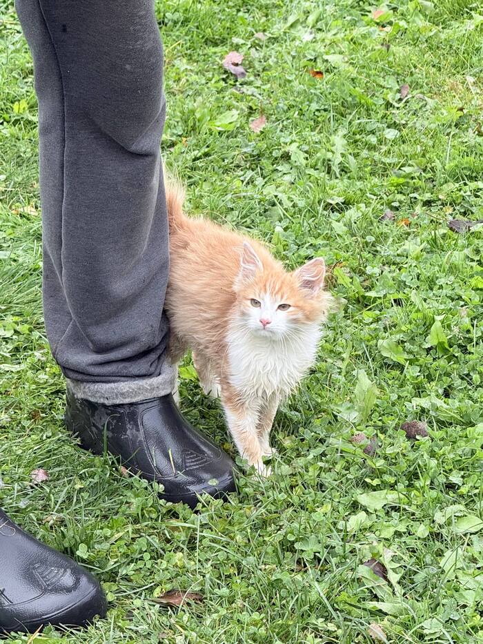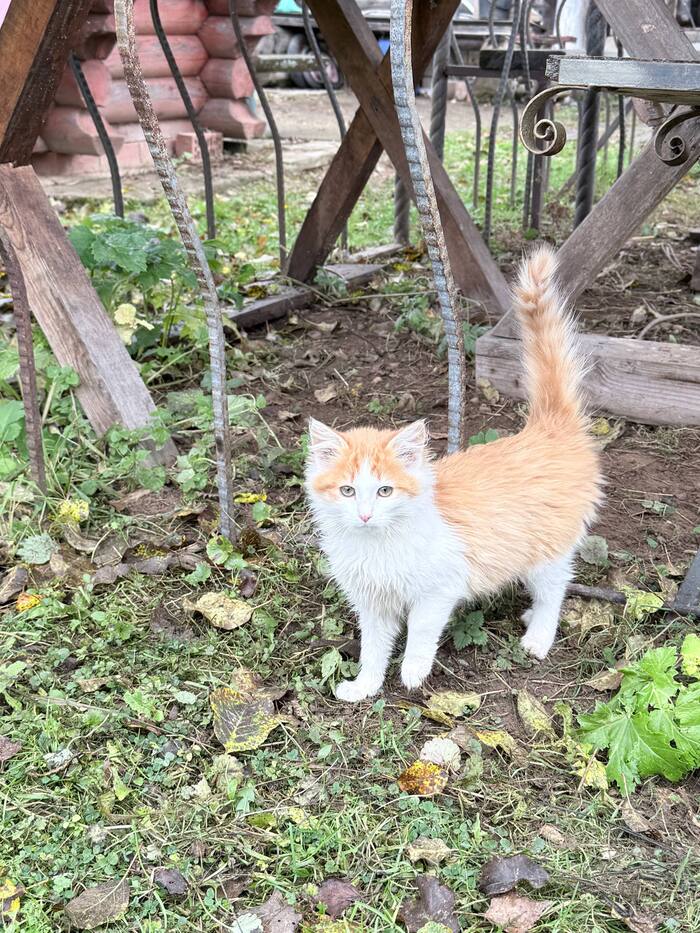 Моросил дождь, всё серое, сырое. Подошёл сосед — разговорились, и за ним увязался рыжий котёнок.