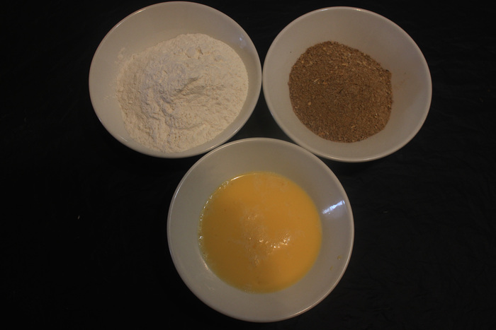 7) Подготавливаем все для панировки классическое трио: сухари, муку и яйца, разбавленные водой.