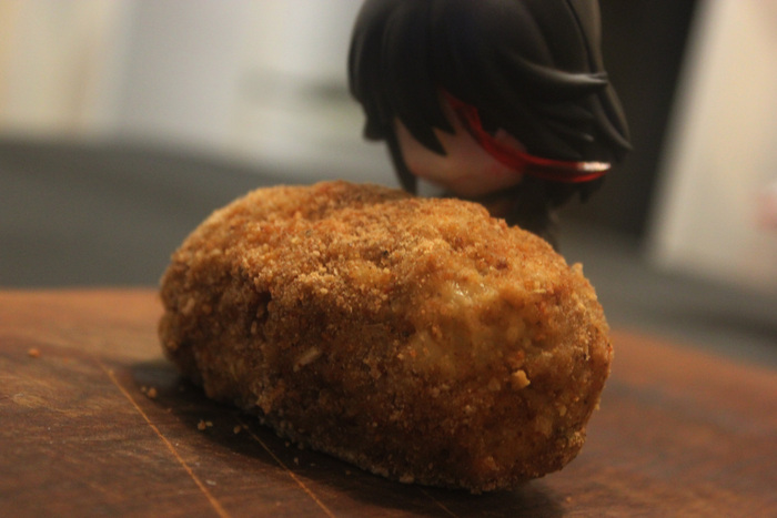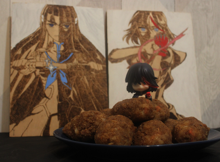 Как можно догадаться, наш сегодняшний "пациент" своего рода аналог французских крокетов и это будет недалеко от истины. Именно из Франции первые рецепты этого блюда перекочевали в Японию, а потом развились в самостоятельный вариант под названием "коррокэ". К слову, собственные версии есть и в других странах. Например, в Венгрии, Польше, Великобритании, Украине, Мексике и Испании. Они различаются подачей, нов целом суть их одинакова - закуска, начинка в которой может быть чем угодно. Отсюда вытекает и вся "непонятность" этого блюда в Kill La Kill. Сюжетно, это конечно, объясняется якобы нищественным существованием семьи Манкансёку, но на самом деле готовить их можно действительно из чего угодно, будь то мясо, овощи, морепродукты и фиг знает что ещё. Простор на эксперименты может быть ограничен разве что либо вашей фантазией, либо содержимым в холодильнике. Но, как можно увидеть из аниме, семью Манкансёку это нисколько не беспокоит.