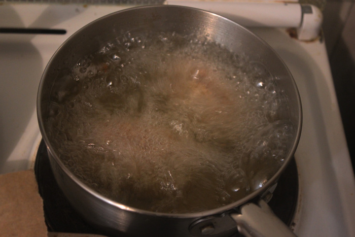 10) Удостоверившись, что масло разогрето достаточно, аккуратно окунаем туда наши котлетки. Советую делать это по одной, максимум - по две, штуки, чтобы ненароком не проворонить момент, когда они превратятся в угольки. Всё что жарится во фритюре, как правило занимает не больше пары минут. В зависимости от количества налитого масла, можно аккуратно переворачивать котлетки для равномерного золотистого колера. Готовые котлетки выкладываем на застеленные бумажным полотенцем противень или большую тарелку, чтобы масло полностью стекло и впиталось в бумагу.